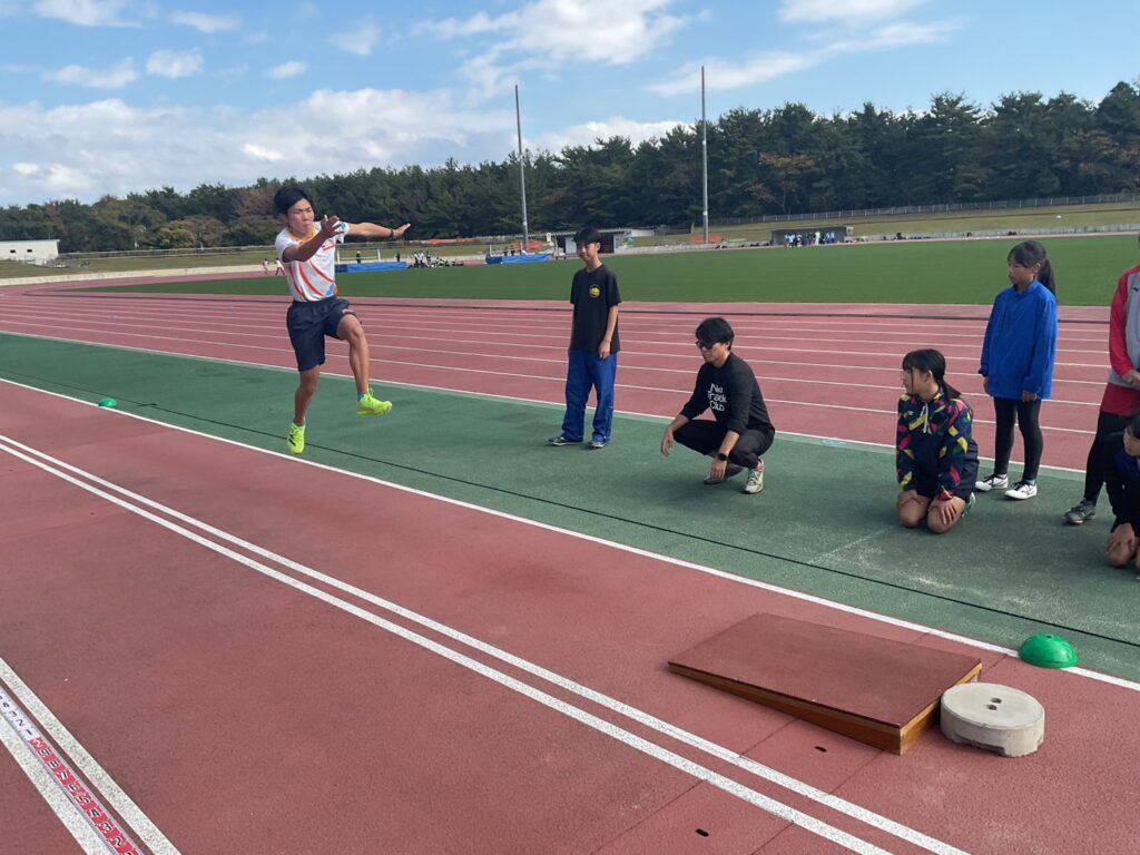 練習では、「どうしてその動きが大事なのか」を丁寧に説明していただきながら、助走、踏切、空中動作(はさみ跳び)、着地と、一つ一つの動きにしっかりとした意味があることを教えていただきました。また印象的だったのは、先生が一人一人の動きを丁寧に見て、その選手に合った言葉で声をかけていたことです。同じ走り幅跳びでも、得意なところや課題は人それぞれ違います。その違いを見抜き、必要なアドバイスを的確に伝えている姿がとても印象に残りました。練習が進むにつれて、選手たちの助走のリズムや踏切の形が少しずつ変わり、跳躍の動きにも変化が見られるようになりました。そして何より、表情に自信が出てきたことがとても印象的でした。